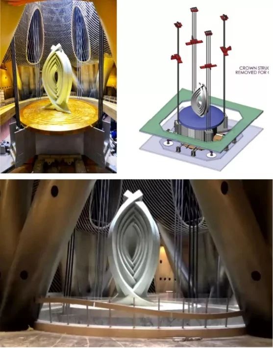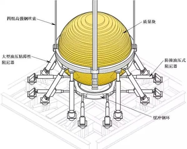 它被安裝在大廈的第126層,由吊索、質(zhì)量塊、阻尼系統(tǒng)和主體結(jié)構(gòu)保護系統(tǒng)四個部分組成,足足有1000多噸重。