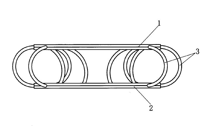 如圖所示,GRY系列輕型鋼絲繩隔振器包括兩片上夾板1及兩片下夾板2,上夾板1及下夾板2為圓環(huán)形,兩片上夾板1通過螺釘和卡條固定安裝在一起,兩片下夾板2通過螺釘固定安裝在一起,兩片上夾板1之間設(shè)有夾持鋼絲繩3的槽,兩片下夾板2之間也設(shè)鋼絲繩3的槽,鋼絲繩3螺旋環(huán)繞在兩片上夾板1與兩片下夾板2之間,鋼絲繩3穿繞在兩片上板1之間或兩片下夾板2之間時(shí)并夾緊在兩片上夾板1之間或兩片下夾板2,上夾板1與下夾板2的結(jié)構(gòu)及尺寸相同,上夾板1及下夾板2為不銹鋼鋼板,鋼絲繩3為不銹鋼鋼絲繩。